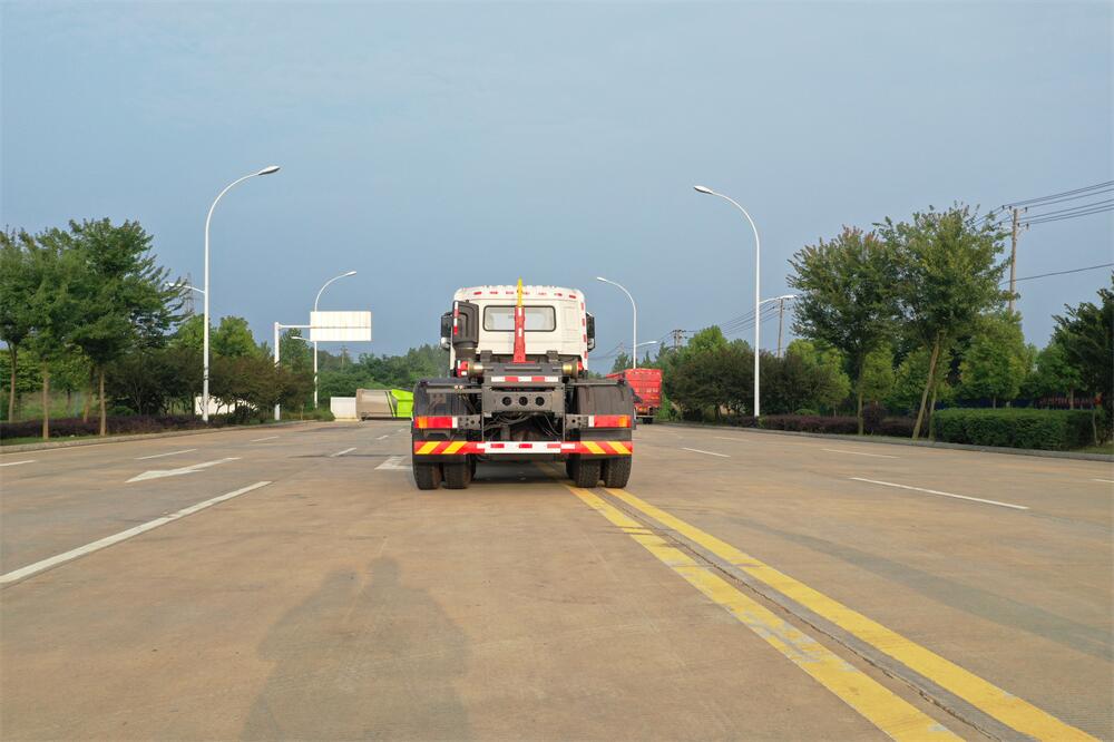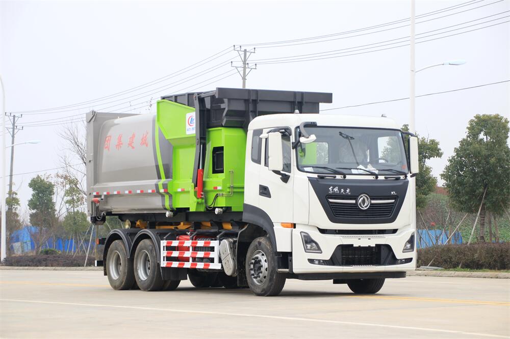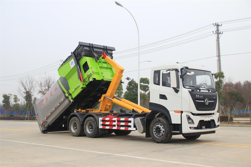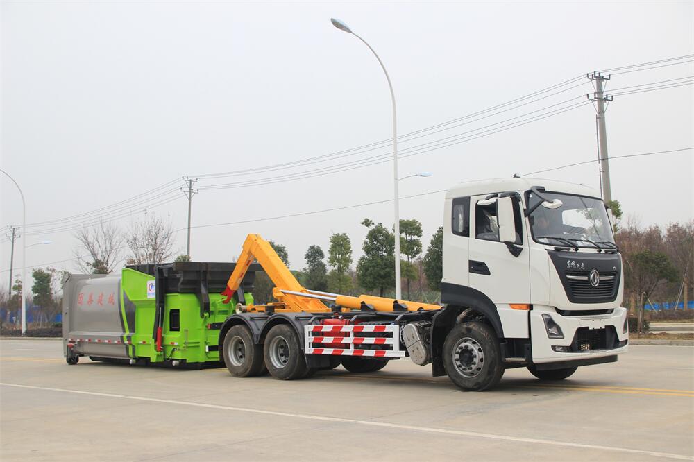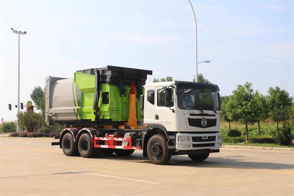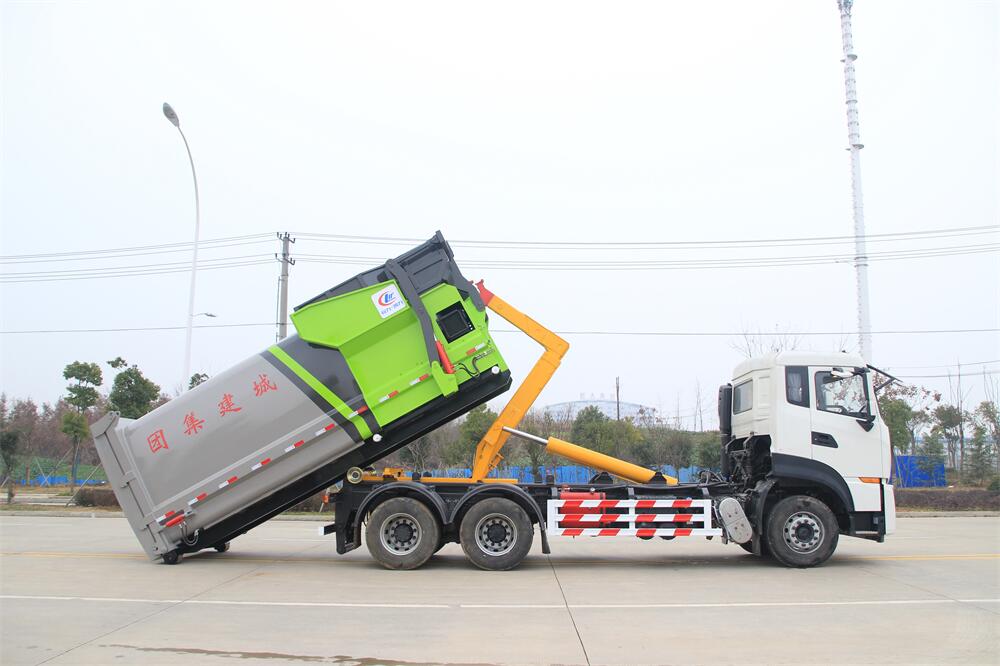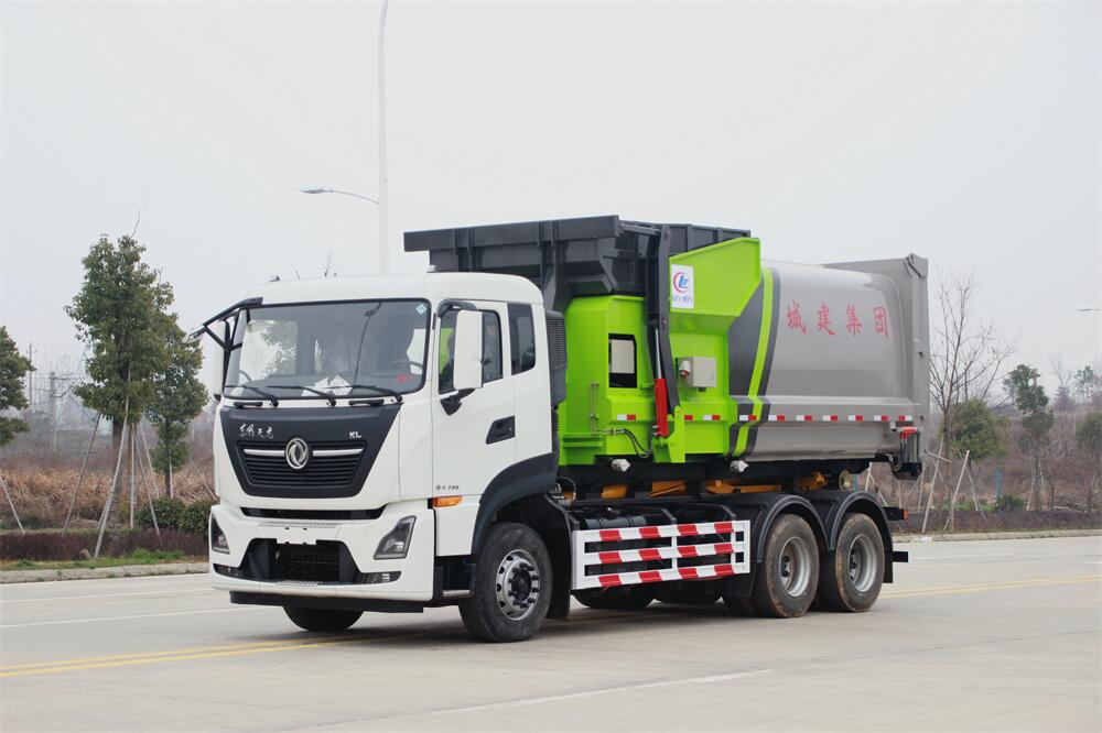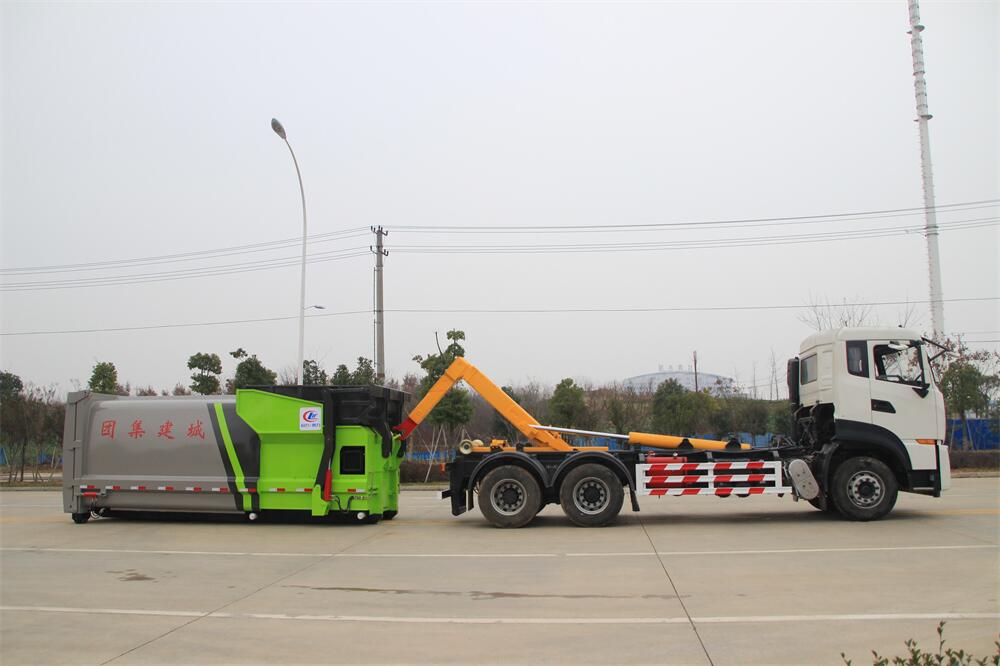勾臂式垃圾車(chē)(車(chē)廂可卸式垃圾車(chē))介紹: 車(chē)廂可卸式垃圾車(chē)又叫拉臂式垃圾車(chē),是一種采用高新設(shè)計(jì)可伸縮的鉤臂,實(shí)現(xiàn)垃圾廂的二次吊裝,自吊上放下,可自行傾倒垃圾的環(huán)衛(wèi)設(shè)備。 拉臂式垃圾車(chē)結(jié)構(gòu)簡(jiǎn)單,操作穩(wěn)定方便,裝卸效率高,機(jī)械化程度高,節(jié)省人力。鉤臂垃圾車(chē)一車(chē)可帶多個(gè)垃圾廂,在裝卸的運(yùn)輸過(guò)程中可有效地避免二次污染。 拉臂垃圾車(chē)采用高新設(shè)計(jì)可擺動(dòng)的鉤臂,垃圾箱由框架、開(kāi)啟油缸、滑輪、后門(mén)和若干加強(qiáng)框架與鋼板焊接而成。調(diào)換貨廂快捷方便,貨廂上帶蓋(倒垃圾時(shí)可翻開(kāi)),鉤臂垃圾車(chē)?yán)鴰w可選用碳鋼、不銹鋼材質(zhì)、內(nèi)部采取環(huán)氧樹(shù)脂防腐處理,改裝部分與原車(chē)底盤(pán)為可分離式,維修方便且保持了原車(chē)的機(jī)動(dòng)性及行駛性能。