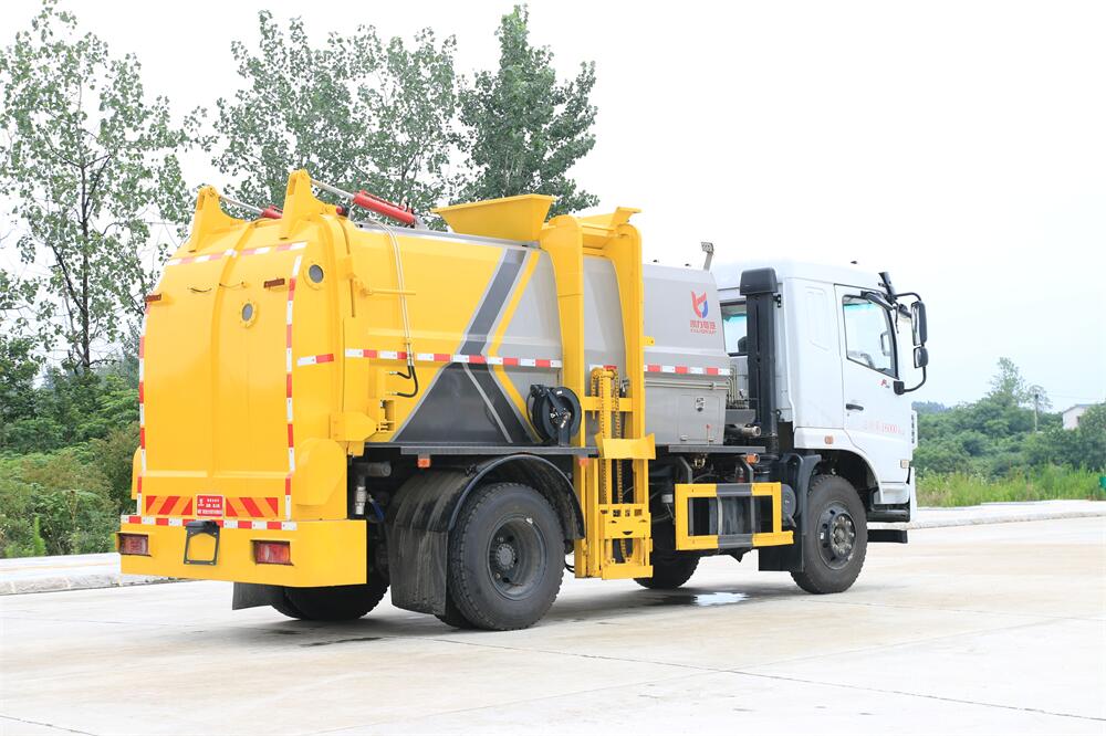 上裝配置:罐體容積10m3,配備120L/240L掛桶提升翻轉(zhuǎn)機(jī)構(gòu),液壓系統(tǒng),后蓋液壓鎖緊開啟,罐體可以舉升自卸,尾部帶自流閥;用于運(yùn)輸液態(tài)垃圾,其特點(diǎn)操作簡(jiǎn)單,密封性好,無(wú)泄漏,無(wú)異味;可選裝固液分離功能,推板擠壓功能,常用于餐館的垃圾轉(zhuǎn)運(yùn)處理。
