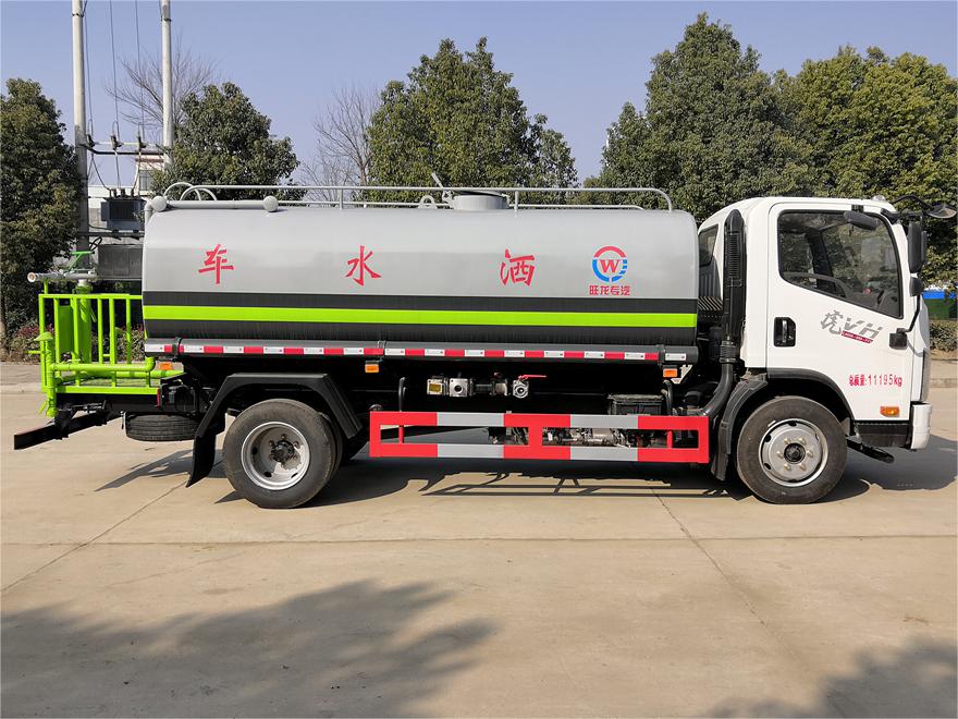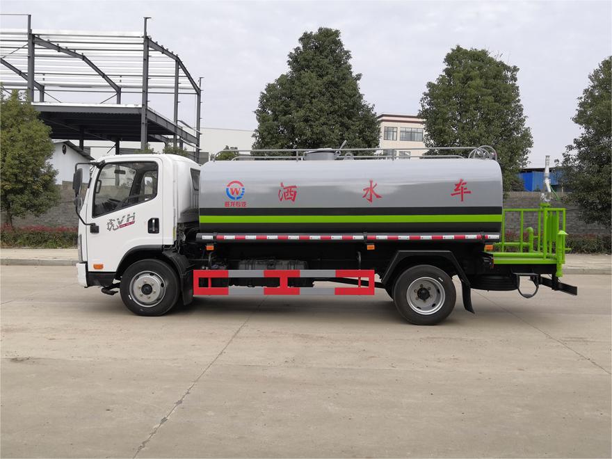 灑水車前裝有鴨形噴嘴或圓頭沖嘴,后面裝有圓柱開灑水噴嘴或蓮蓬頭噴嘴,后部有一工作平臺(tái),裝配有水炮。后部還可裝8個(gè)噴嘴(選裝)。