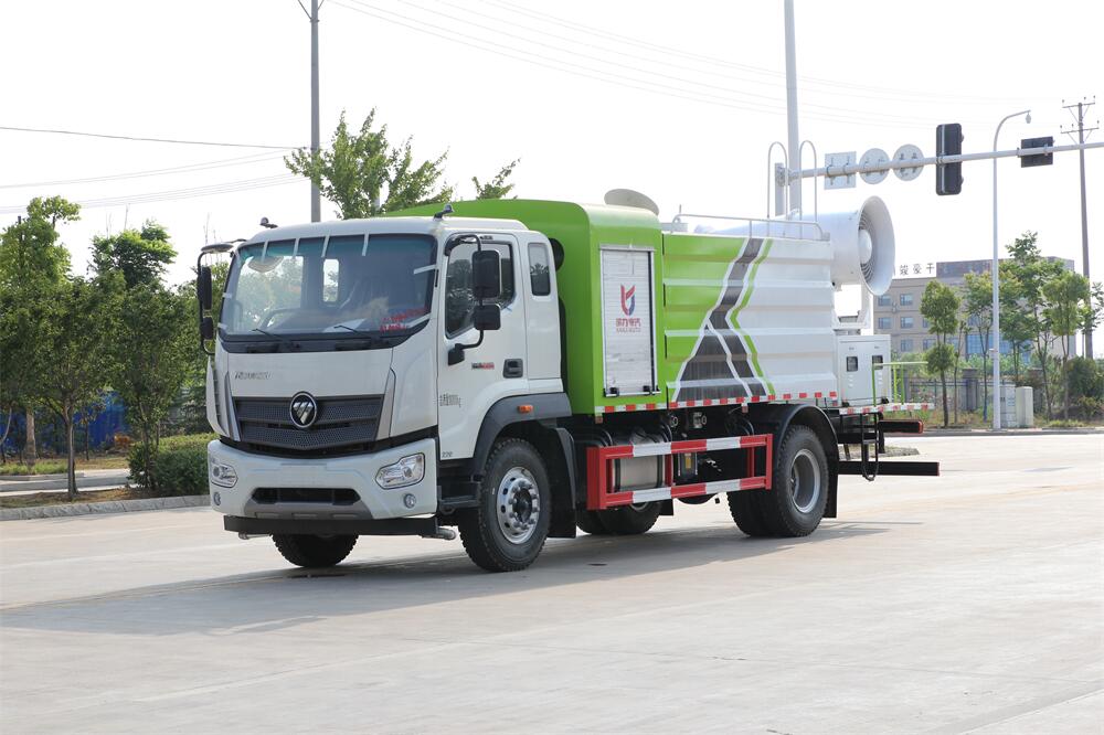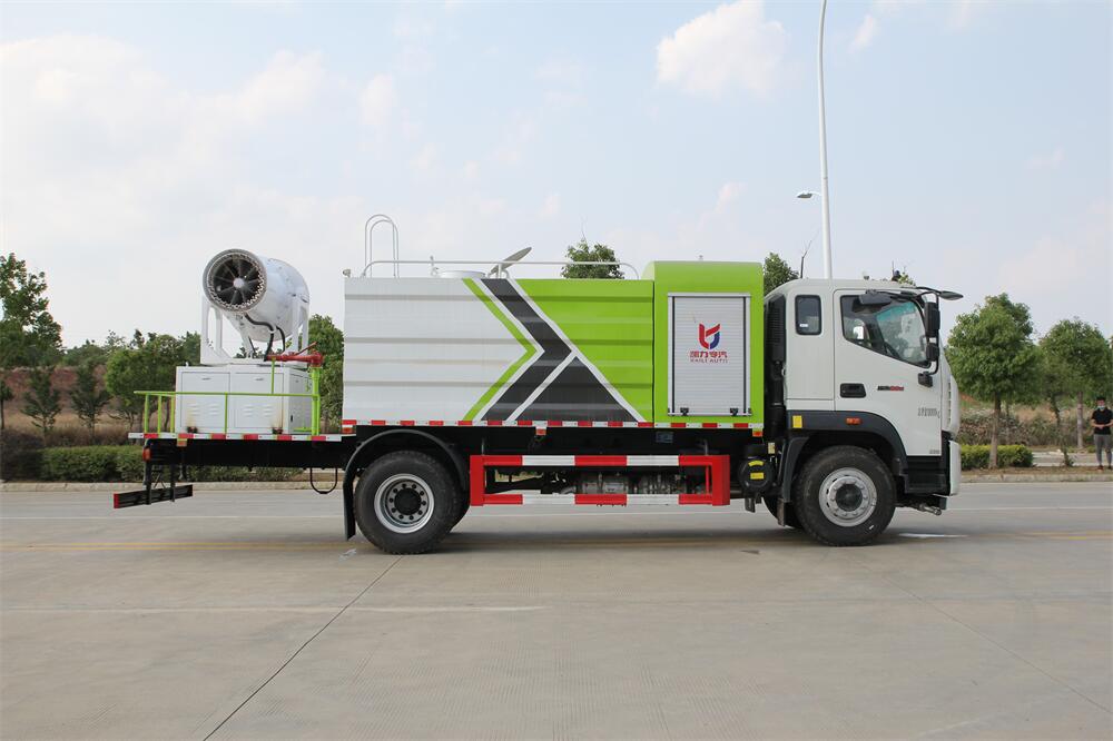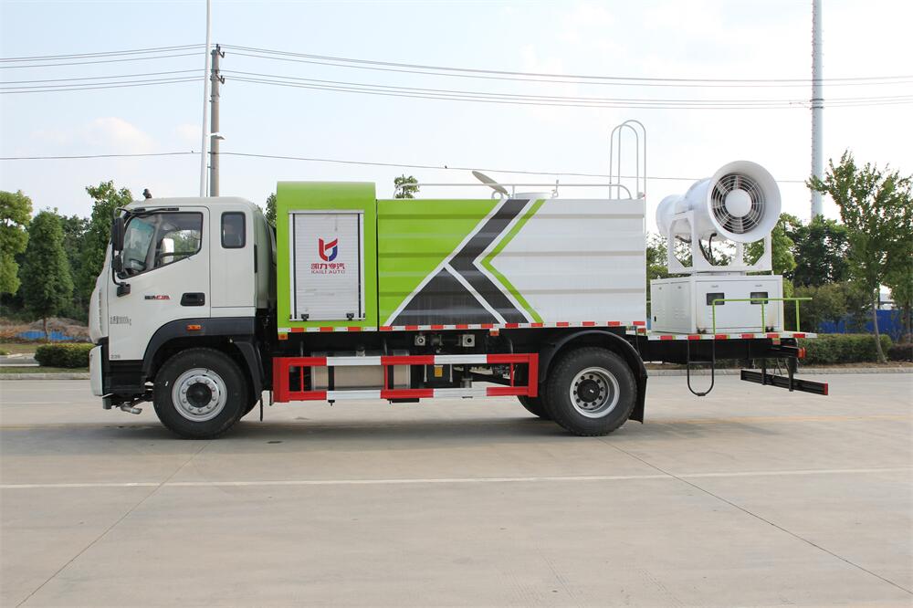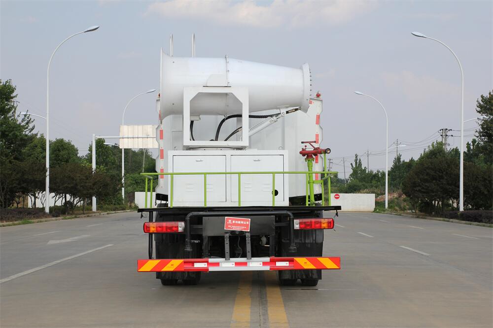 上裝配置:罐體容積為 12立方,選配風(fēng)送式霧炮機(jī)組射程30米、40米、50米、60米、80米、100米、120米霧炮,罐體鋼板為4mm碳鋼Q235材質(zhì),罐內(nèi)隔板具有防波作用,以減輕汽車行駛時罐體液體沖擊,罐體及整車外形尺寸按照公告。帶大功率專用灑水泵,泵可自吸自排,整車前沖、后灑、側(cè)噴、帶65消防接口,后平臺配CLW-50、CLW-60、CLW-80、CLW-100、CLW-120型風(fēng)送式霧炮機(jī)組;罐體前封頭配大功率柴油發(fā)電機(jī)組;前封頭帶水位計(jì),后平臺主管路帶1寸澆花接口,后爬梯。帶兩根輸水管及陰陽端。罐體顏色:銀/灰/綠,罐體兩側(cè)噴“多功能抑塵車”字樣,貼反光標(biāo)示。