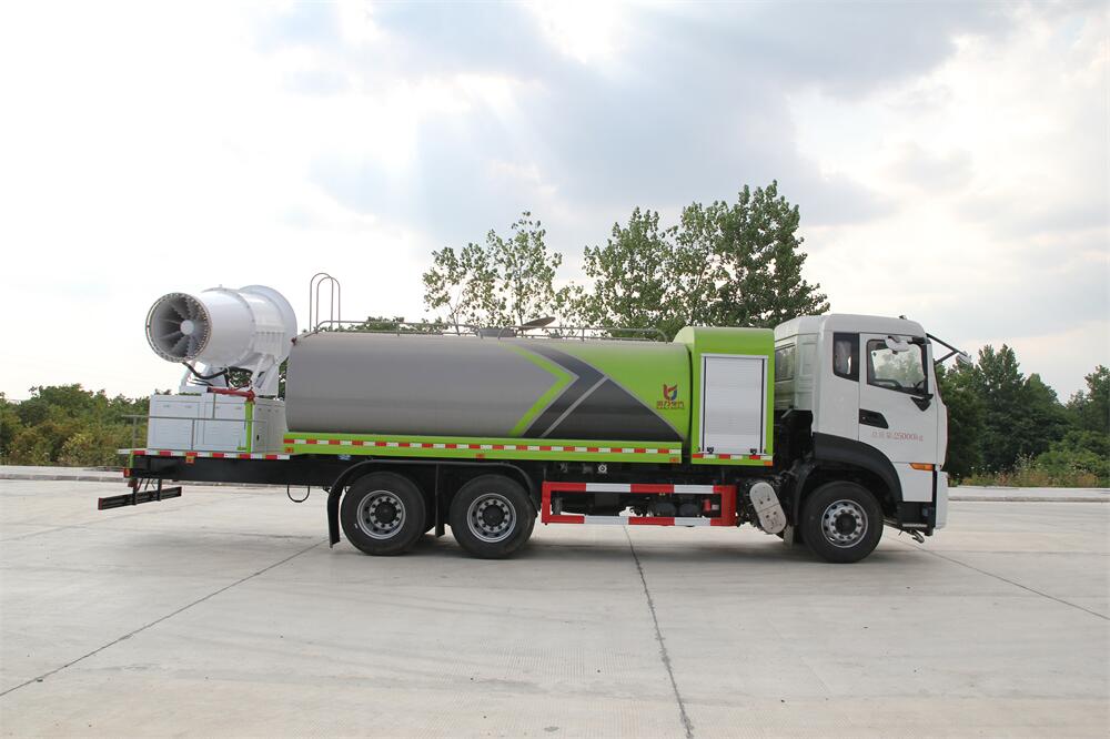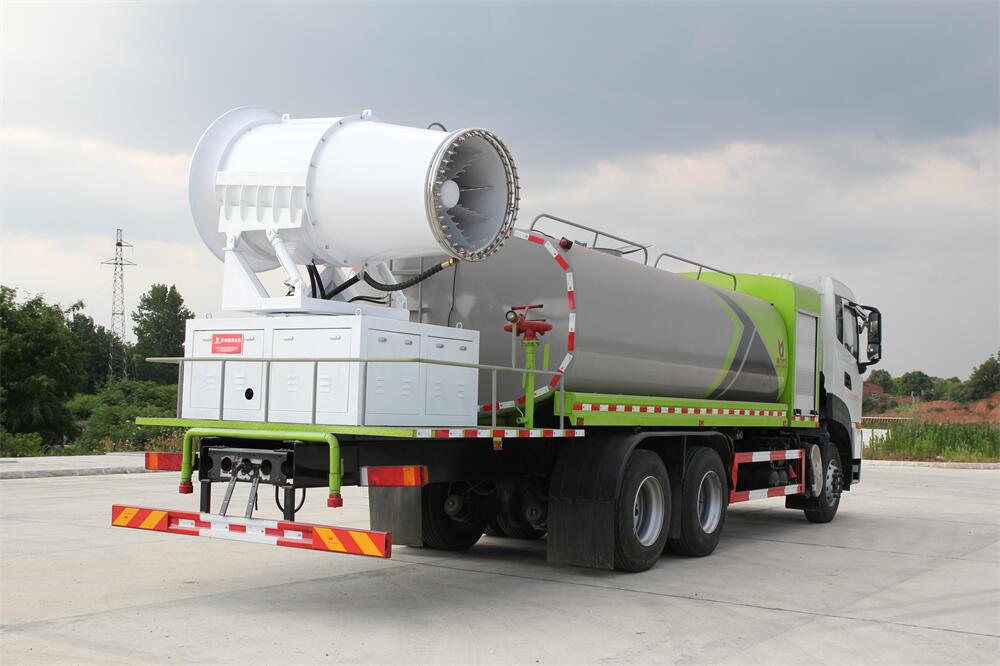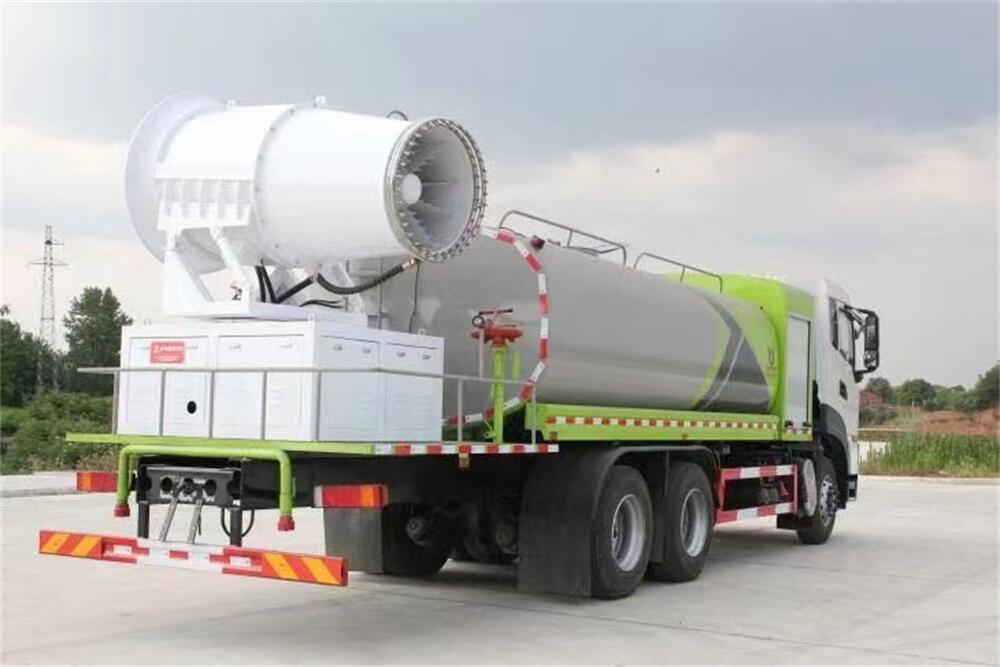 上裝配置:罐體容積為 16立方,選配風(fēng)送式霧炮機(jī)組射程30米、40米、50米、60米、80米、100米、120米霧炮,罐體鋼板為4mm碳鋼Q235材質(zhì),罐內(nèi)隔板具有防波作用,以減輕汽車行駛時(shí)罐體液體沖擊,罐體及整車外形尺寸按照公告。帶大功率專用灑水泵,泵可自吸自排,整車前沖、后灑、側(cè)噴、帶65消防接口,后平臺(tái)配CLW-50、CLW-60、CLW-80、CLW-100、CLW-120型風(fēng)送式霧炮機(jī)組;罐體前封頭配大功率柴油發(fā)電機(jī)組;前封頭帶水位計(jì),后平臺(tái)主管路帶1寸澆花接口,后爬梯。帶兩根輸水管及陰陽端。罐體顏色:銀/灰/綠,罐體兩側(cè)噴“多功能抑塵車”字樣,貼反光標(biāo)示。