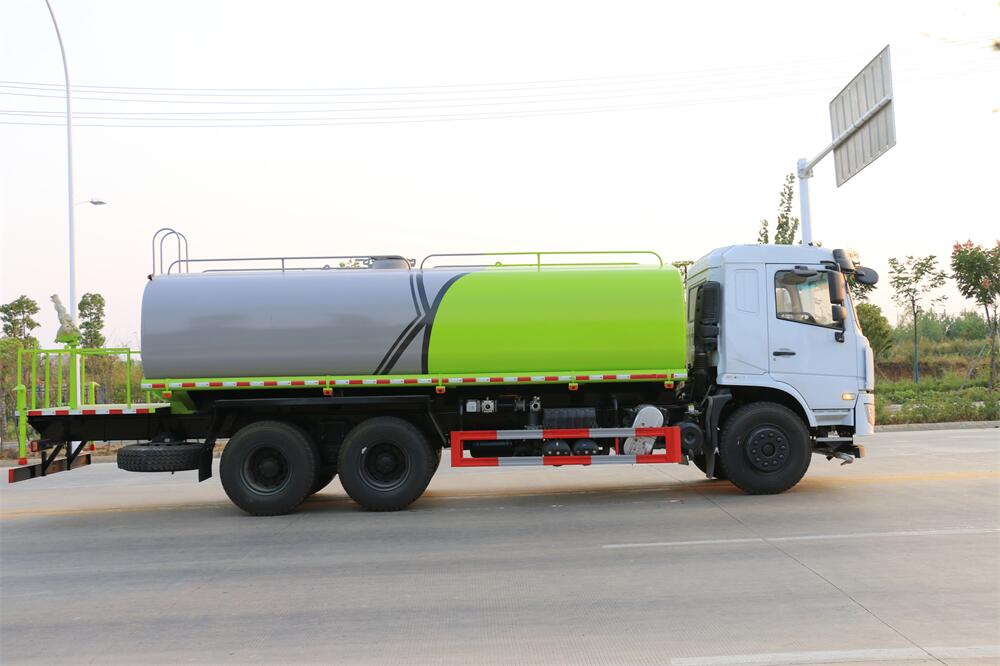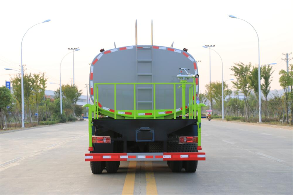 灑水車前裝有鴨形噴嘴或圓頭沖嘴,后面裝有圓柱開(kāi)灑水噴嘴或蓮蓬頭噴嘴,后部有一工作平臺(tái),裝配有水炮。后部還可裝8個(gè)噴嘴(選裝)。